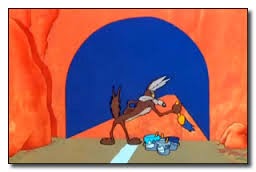 Fictional Tromp-l’oeil appears in many Looney tunes, such as the Road Runner cartoons, where, for example, Wile E. Coyote paints a tunnel. This is usually followed by the Coyote’s foolishly trying to run through the tunnel after the Road Runner, only to smash into the hard rock face.